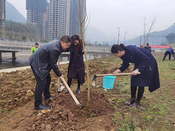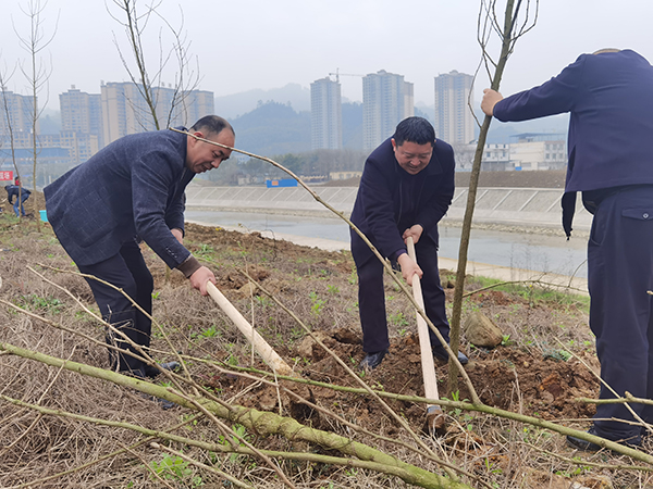 当天上午,刘朝平、谢晓丹一行来到位于筠连县定水河畔滨河绿化景观带的植树现场,挖坑、扶苗、培土、踩实、浇水,每道工序一丝不苟、认真细致。大家齐心协力,配合默契,合力栽下一棵棵树苗。经过植树人员1个多小时的劳动,共栽种下了100余棵银杏树,为城市绿化景观带再添新绿。