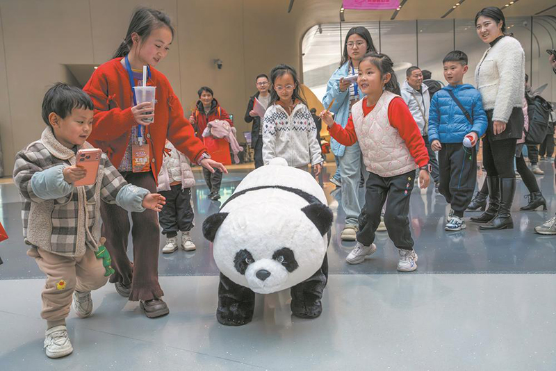 AI智能 孩子与一只打扮成大熊猫的四足机器人互动。近年来,成都开放全域作为机器人的训练场景,大力发展AI机器人产业,已形成完整产业链,聚焦协作、物流、医疗等方向。在机器人大世界、天府四街的成都阿加犀智能科技有限公司、东部新区的天府绛溪实验室,均有可能现场见到正在接受训练的机器人,感受科技发展的脉动。蒋光丛 摄