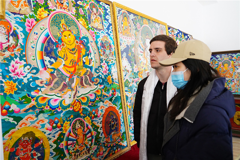 在壤巴拉非遗传习创业园传习中心,外国友人了解到,藏族唐卡(觉囊画派)在雪域藏地活态传承了1027年。藏族唐卡(觉囊画派)因其造型准确生动,画工精细绝美,线条勾勒精致,色彩鲜艳,富于装饰性,属工笔重彩一类,表现了一种华丽、细腻风格,具有浓烈的感染力和震慑力,被誉为“洁净精微的觉囊画派”。
