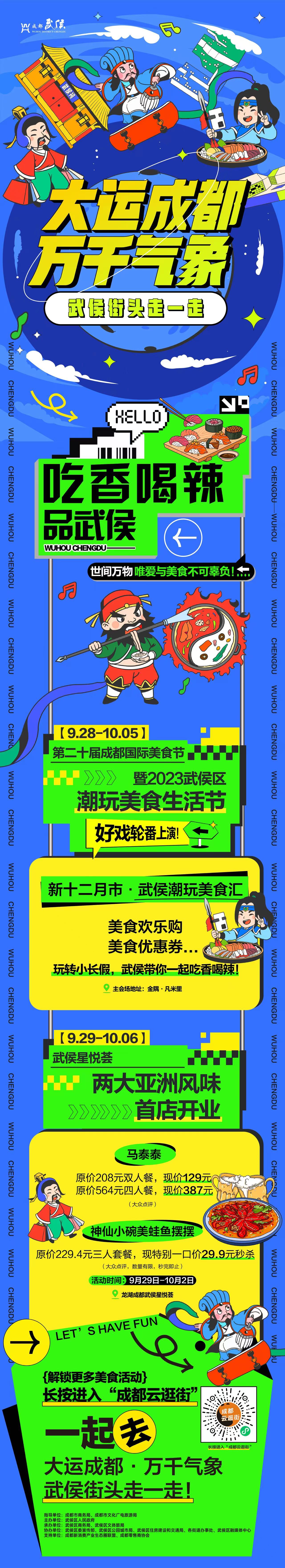 9月29日-10月6日,武侯中秋国庆促消费活动潮酷来袭!本次活动以“大运成都·万千气象——武侯街头走一走”为主题,“琳琅满目购武侯、吃香喝辣品武侯、优哉游哉逛武侯、文艺雅集醉武侯”4大主题活动,将为广大市民游客呈现一个潮动古今、万千气象的武侯。“武侯街头走一走·吃喝玩乐购全都有”国庆指南将通过“成都云逛街”微信小程序发布,三国人物带你一键解锁各种潮流玩法。