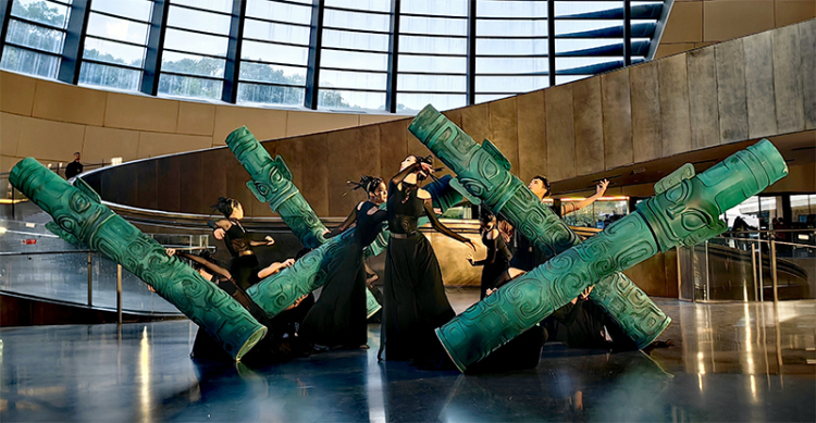 学术讲座之后,一场别开生面的现场艺术演绎将活动推向高潮。演出分布于三星堆博物馆陈列馆广场、螺旋楼梯、下沉空间等多元空间,舞者将艺术叙事融入博物馆建筑、公共空间和自然场域。本次展演汇聚全国顶尖舞蹈力量,八大节目各具特色,群舞《垂直纪元》借助螺旋楼梯的空间布局,舞者们仿佛从远古的青铜印记里慢慢走来,他们的肢体语言时而刚劲有力,时而灵动飘逸,似在诉说着古蜀先民的智慧与坚韧。