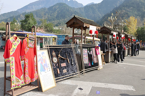 当天,位于主会场周围的羌韵市集人头攒动,热闹非凡。市集设有非遗技艺展销区、文创展销区及特色美食区。此外,身着羌服的NPC工作人员与游客进行互动,通过答题、对歌对诗等形式,增强游客的参与性与趣味性。