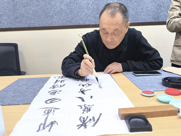 活动当天,多名书法达人与爱好者齐聚一堂,不仅开展了技法研讨、即兴创作、作品赏析等交流,更围绕经典诗词、美好祝愿等内容挥毫泼墨,在笔墨流转间传承文化基因,弘扬中华优秀传统文化。多种风格的书法作品渐次呈现,吸引办理业务的客户驻足欣赏。