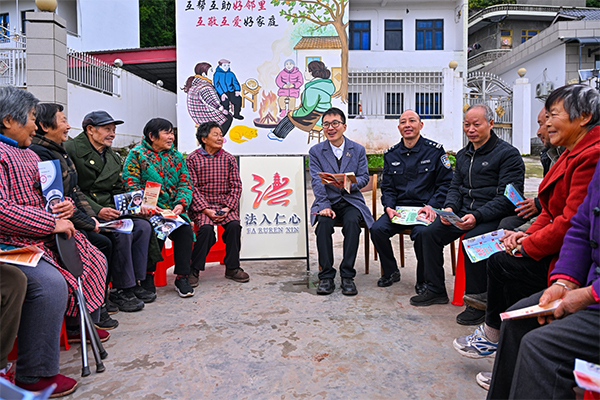 司法所工作人员在给村民开展普法宣传 摄影 潘帅