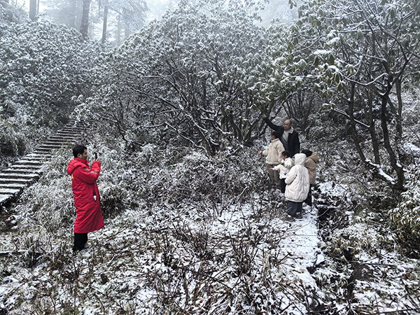 “我们全程徒步上山,路上阳光明媚,看到了小松鼠和瀑布。山顶的雪景可漂亮了!”资阳游客左晨熹兴奋地说。