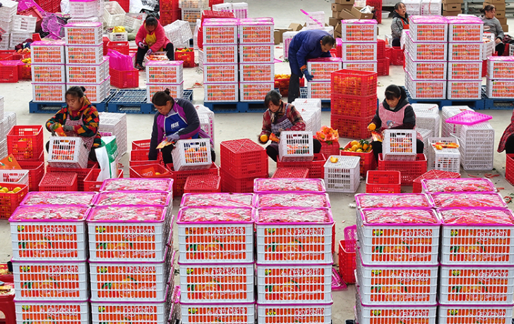 工人分拣、打包、装箱发往东南亚市场的柑橘