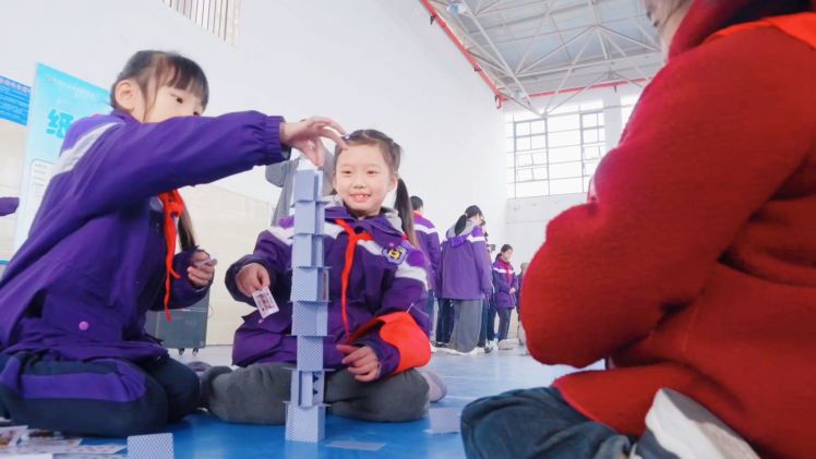 另一边“建造热潮”不减。二年级小“建筑师”仅凭108张纸牌,在无胶水辅助下搭建“摩天楼”。屏息安放、反复校准,平衡与耐心成了通关关键。“在家练了好多次,叠紧纸牌稳地基,最高能搭14层!”学生林崎松分享着秘诀。这看似简单的游戏,实则是结构工程学启蒙——孩子们在“搭建-倒塌-重建”中,悄然掌握“力与平衡”的奥秘。