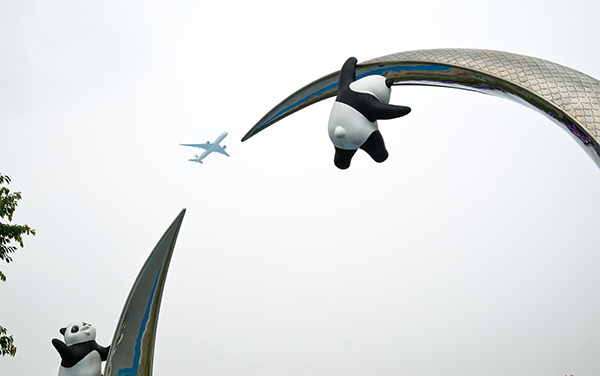 园区的熊猫雕塑和双流机场起飞的飞机相映成趣 摄影:王勤