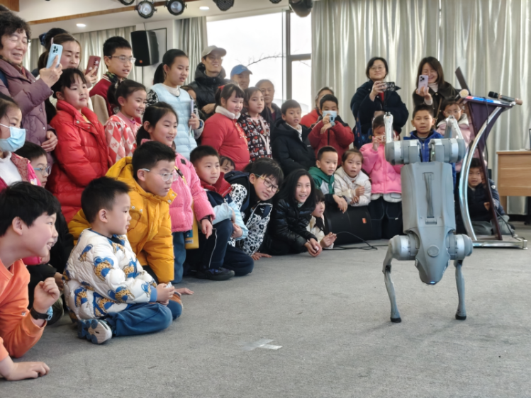 在AI机器人讲座环节,木马老师以图文、视频的形式为孩子们展示了各类机器人,并讲解了什么是AI,以及AI时代孩子们应具备的关键能力——“发现问题的能力、驾驭AI的能力、创造力与表达分享欲”。为了让孩子们近距离感受AI,木马老师现场让孩子们体验仿生机器狗的智能。这款机器狗不仅能走路、跳舞、爬楼,还能给孩子们比心握手,引得孩子们阵阵欢呼。