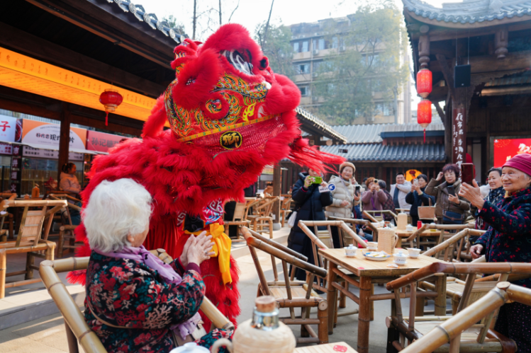夜市入口处的露天茶园升级为川西民居建筑风情的当垆茶肆,白天竹椅盖碗茶尽显成都悠闲;夜晚戏台演绎汉代风韵、展演《凤求凰》相关剧目,川茶蜀酒间藏着街巷历史与温情。当天,当垆茶肆前举行了“琴韵传情贺新春·茶肆寻味话团圆”2026年迎春活动,以经典剧目、传统民俗等形式,让居民沉浸式感受新春喜乐。