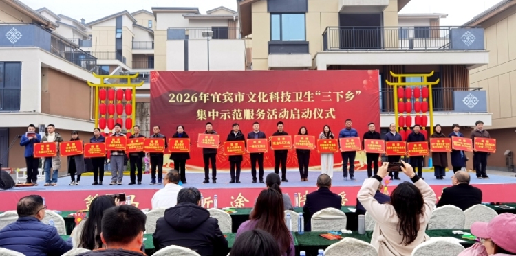 2月11日上午,2026年宜宾市文化科技卫生“三下乡”集中示范服务活动在兴文县正式启动。宜宾市委宣传部、宜宾市文广旅游局、宜宾市科技局、宜宾市卫生健康委等20个市级部门为当地群众送上政策、文化、科技、卫生类新春惠民“大餐”。