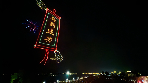 晚上8点,灯光渐暗,千架无人机缓缓升空,搭配爆闪装置和烟花特效,在空中勾勒出一幅幅精美画卷。国际竹编艺术博览馆、程夫人教子等画面依次呈现,将青神人文底蕴展现得淋漓尽致;青神萤宝、飞马腾空、“马年大吉”“马到成功”等新春元素闪亮夜空。最后,彩色流光勾勒的“我在青神等您”璀璨登场,向八方来客发出诚挚的新春邀约。