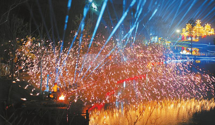 2月11日,广元2026女皇故里彩灯会上的打铁花表演。