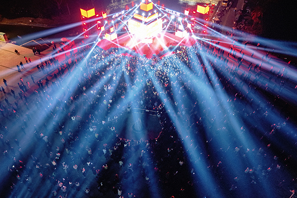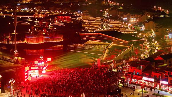 非遗火舞点火仪式将活动推向高潮。非遗传承人执火起舞,绚烂光影中,象征兴旺吉祥的篝火熊熊燃起,照亮古村夜空。蒙古舞蹈、民族歌曲、武术《龙马精神》接续登场,刚柔并济、精彩纷呈;DJ电音派对动感十足,传统年味与现代活力碰撞出圈。篝火旁,全场观众手拉手跳起锅庄舞,欢声笑语此起彼伏。