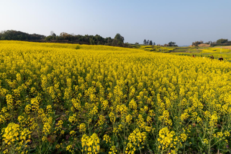 乡村田野间,金黄的油菜花竞相绽放,漫山遍野的金黄随风起伏,形成一片金色海洋,与错落的农房、蜿蜒的田埂构成一幅绝美乡村画卷。富牛镇、修文镇等地的油菜花海中,游客们漫步花间小径,尽情感受田园春光,孩童在花海旁嬉戏,勾勒出乡村振兴的生动图景。