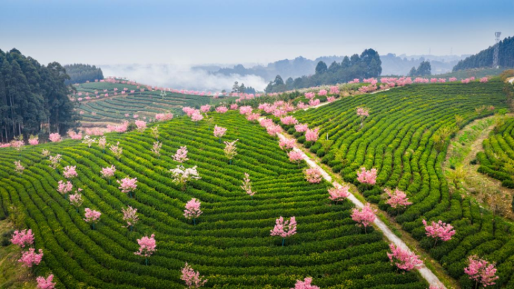 思蒙镇工农村明太茶园内,樱花与茶园交相辉映,粉红的樱花点缀在层层叠翠的茶垄间,“茶绿樱红”的景致独具韵味。游客穿行茶垄间,既能欣赏樱花的柔美,又能感受茶园的清新,沉浸式体验茶旅融合的独特魅力,该茶园成为春日里的热门打卡地。
