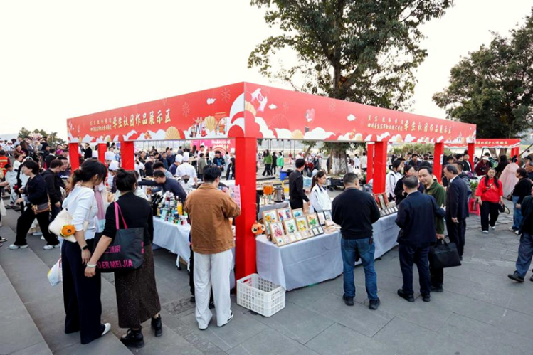 舞台两侧,社团技能展示区同样热闹非凡。烙画、版画、衍纸、罗甸贝壳工艺、掐丝珐琅等展区的每一件作品都蕴含着创作者的巧思与情感,吸引了不少游客驻足欣赏、购买留念。更有小朋友在家长的陪同下,亲身体验了一把非遗的魅力。师生们现场制作的地道燃面、李庄白肉,以及精致糕点和特色调饮,让游客们大饱口福,赞不绝口。