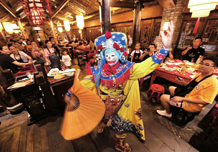 食客在成都宽窄巷子景区内边吃火锅边观看“变脸”表演。图据新华社客户端