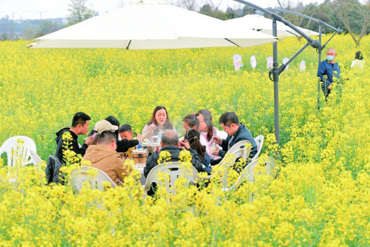 成都邛崃天府农趣乐园,市民在花田中吃火锅。成都文旅邛州公司供图