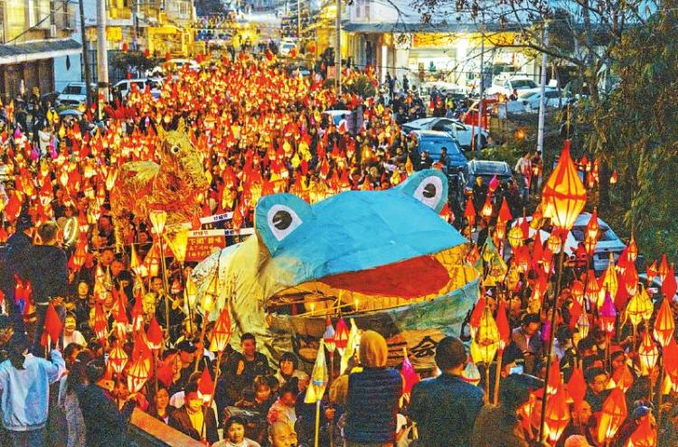 南充嘉陵 3月2日,南充市嘉陵区三会镇,村民与游客手持蛴蟆灯前行,汇成流动星河。 张翔升 摄