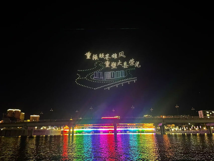 晚上8时,红桥上空,“红城光影赏元宵”无人机展演惊艳启幕。千架无人机腾空而起,以夜空为幕,光影为笔,不断变幻出龙潭飞瀑、旺苍酸辣粉等标志性图案,打造出梦幻的空中图腾。东河两岸,欢呼声与快门声此起彼伏,市民们共同记录下这一科技感十足的浪漫时刻。